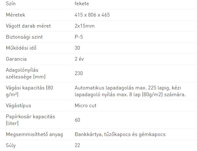 Egyszerre akár 225 lap (A4, 80 g/m2) automatikus adagolása. Kézi lapadagoló nyílás max. 8 lap számára. P-5 mikrokonfetti vágás (2x15mm). 60L-es, kihúzható hulladéktartály, a görgőknek köszönhetően könnyen mozgatható és áthelyezhető. Anti-jam / elakadásmentes technológia. Bankkártyát, tűzőkapcsot és gémkapcsot is megsemmisít. 30 perces folyamatos működési idő ventilátor hűtéssel, a használatot követő 3 perc múlva alvó üzemmódba kapcsol. Érintőkijelzős kezelőpanel. Rendkívül halk működés, 55dbA zajszint. Infravörös tartálytelítettség-érzékelő. 2 év garancia, 2 év vágókés garancia.