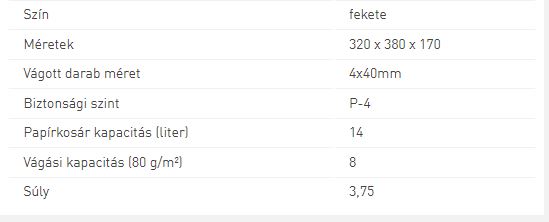 Egyszerre 8x A4 lap (80g/m2) megsemmisítéséhez. Konfetti vágás (P-4 DIN biztonsági szint). 14L (125 A4 lap) kapacitású hulladéktartály leemelhető tetővel és betekintő ablakkal a telítettség nyomon követésére. Csendes iratmegsemmisítés < 70 dbA zajszint. Tűzőkapcsot és gémkapcsot is megsemmisít. 3 perces folyamatos működési idő. Manuális hátra- és előremenet funkció. 2 év garancia, 2 év vágókés garancia.