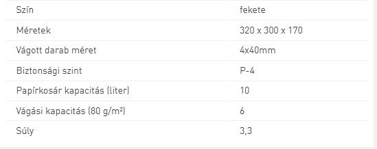Egyszerre 6x A4 lap (80g/m2) megsemmisítéséhez. Konfetti vágás (P-4 DIN biztonsági szint).10L (100 A4 lap) kapacitású hulladéktartály leemelhető tetővel és betekintő ablakkal a telítettség nyomon követésére. Csendes iratmegsemmisítés < 70 dbA zajszint. Tűzőkapcsot és gémkapcsot is megsemmisít. 3 perces folyamatos működési idő. Manuális hátra- és előremenet funkció. 2 év garancia, 2 év vágókés garancia.