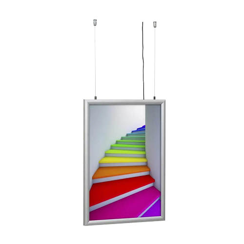 A/1 méretű, beltéri, álló, 2 oldalas LED plakátkeret; 25 mm széles kipattintható, eloxált alumínium keret; tartozék: tápegység (12V/2A), 3,5 m vezeték, függesztő készlet, tükröződésmentes PVC fólia; 2 év garancia.